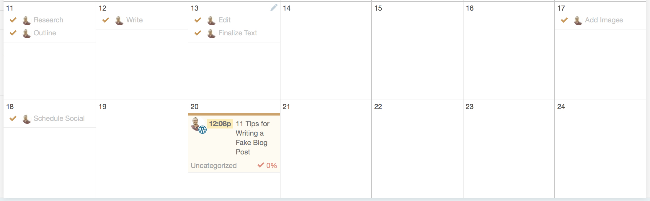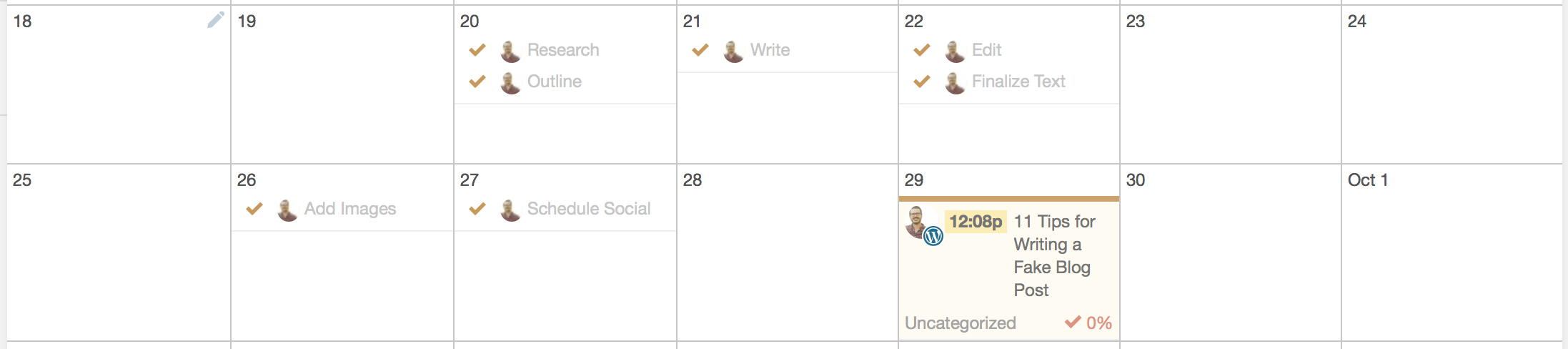 So, hypothetically, let’s say I want to post an article on the 20th. I know I want to have the post writing finalized the week before, so I’ll schedule my research and outlining for 9 days before it goes live. I’ll then schedule (assign a task to myself) my writing for 8 days before, followed by editing and finalizing the week before.