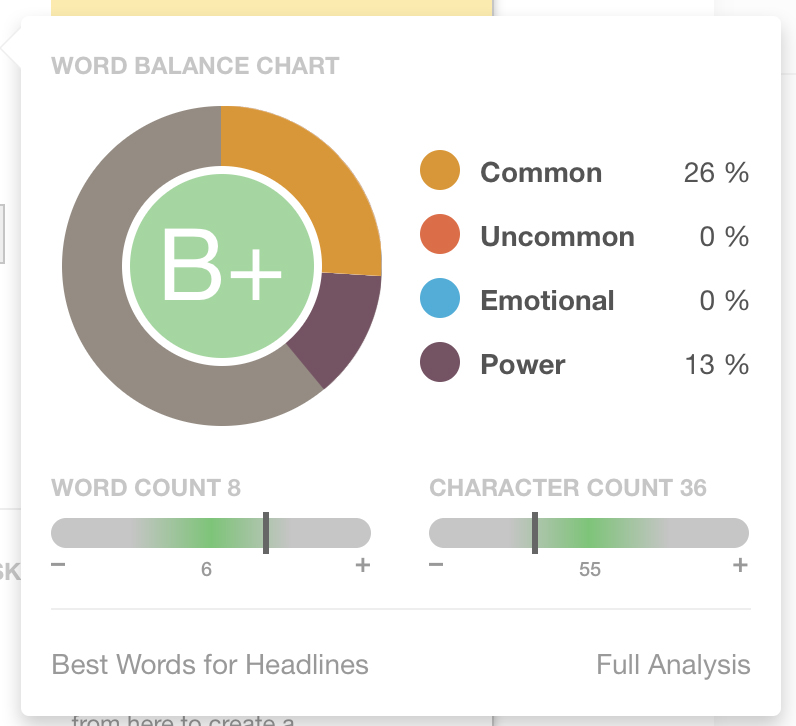 The scores take into account word count, character count, and word balance (emotional, common, uncommon, power), among other things, to give you an idea of what you may need to tweak to come up with a better headline.