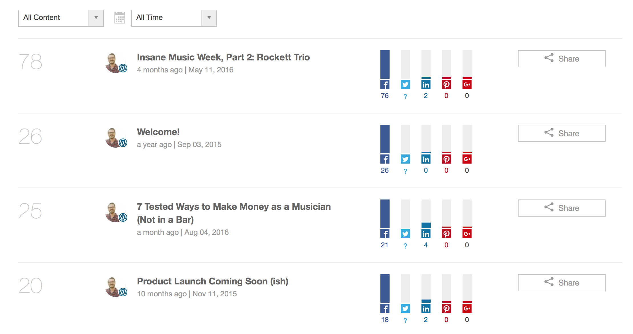 What’s more, CoSchedule has a feature that shows you your top posts and content. It’ll list your posts in order of the most shares, and show you how many shares you’ve gotten on Facebook, LinkedIn, Pinterest, and Google+. Unfortunately, because of Twitter’s change to their API last November, the Twitter share count isn’t currently available. I’m sure they’ll figure out how to get that back, though.